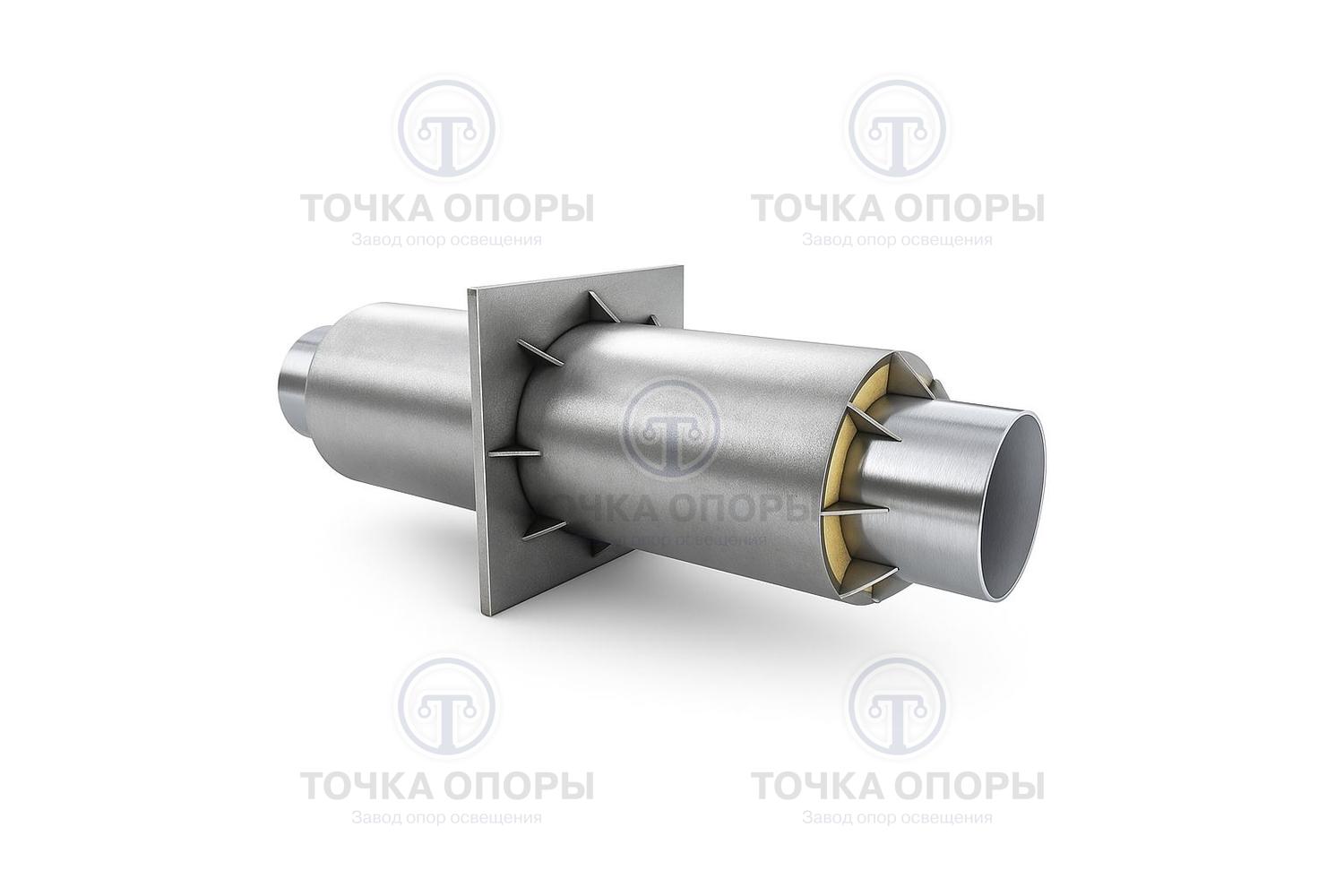 • Конструкция предусматривает возможность обустройства изоляции: опора устанавливается до напыления ППУ, при этом сохраняется целостность изоляционного слоя за счёт герметичных переходных элементов.